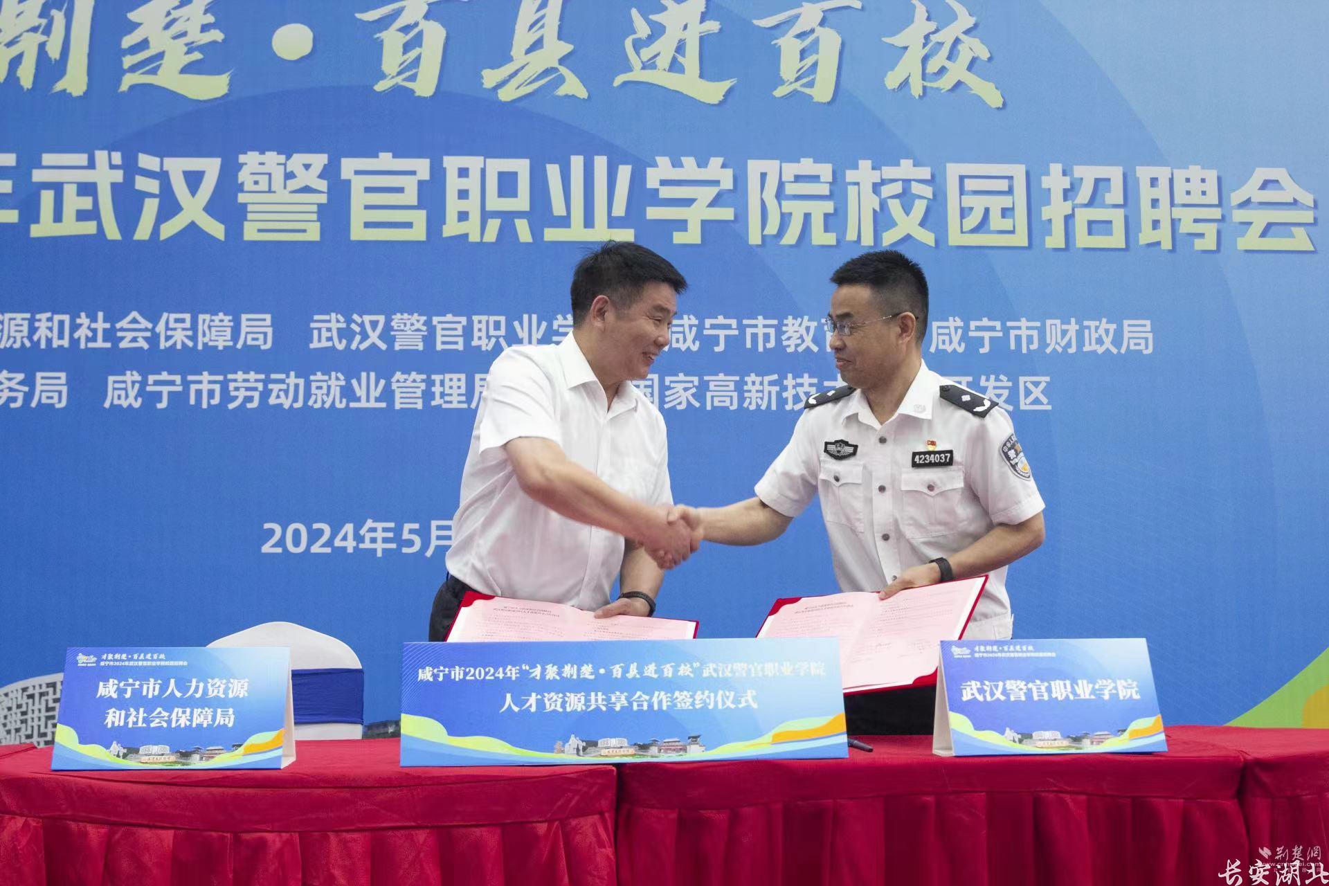 活动现场,咸宁市人社局与武汉警官职业学院签订人才资源共享合作协议,就校园招聘、实习实训、社会实践等方面开展合作,促进双方在人才、科研、教学等领域的交流共建,为咸宁市招才引智工作推进搭建良好平台。